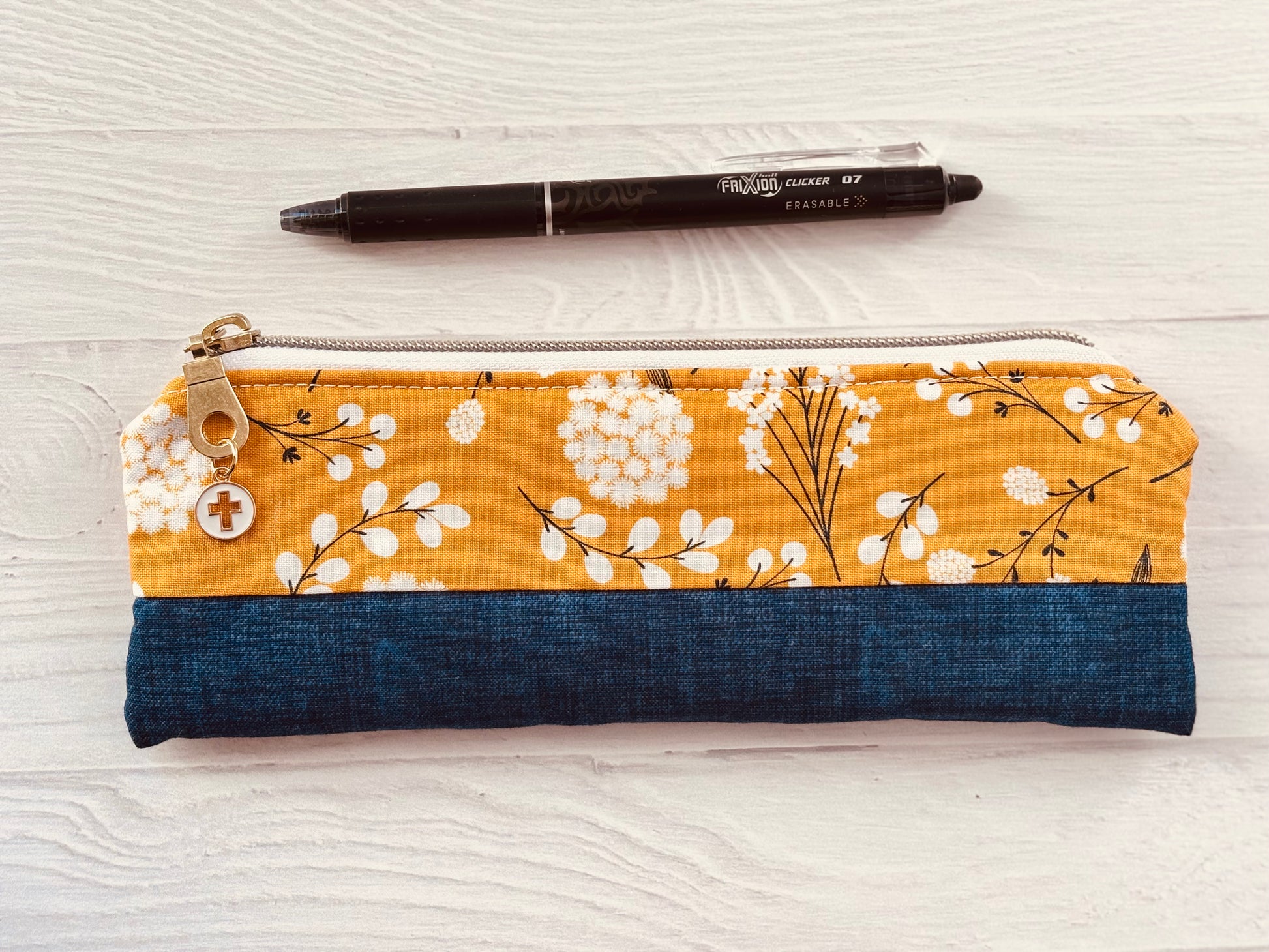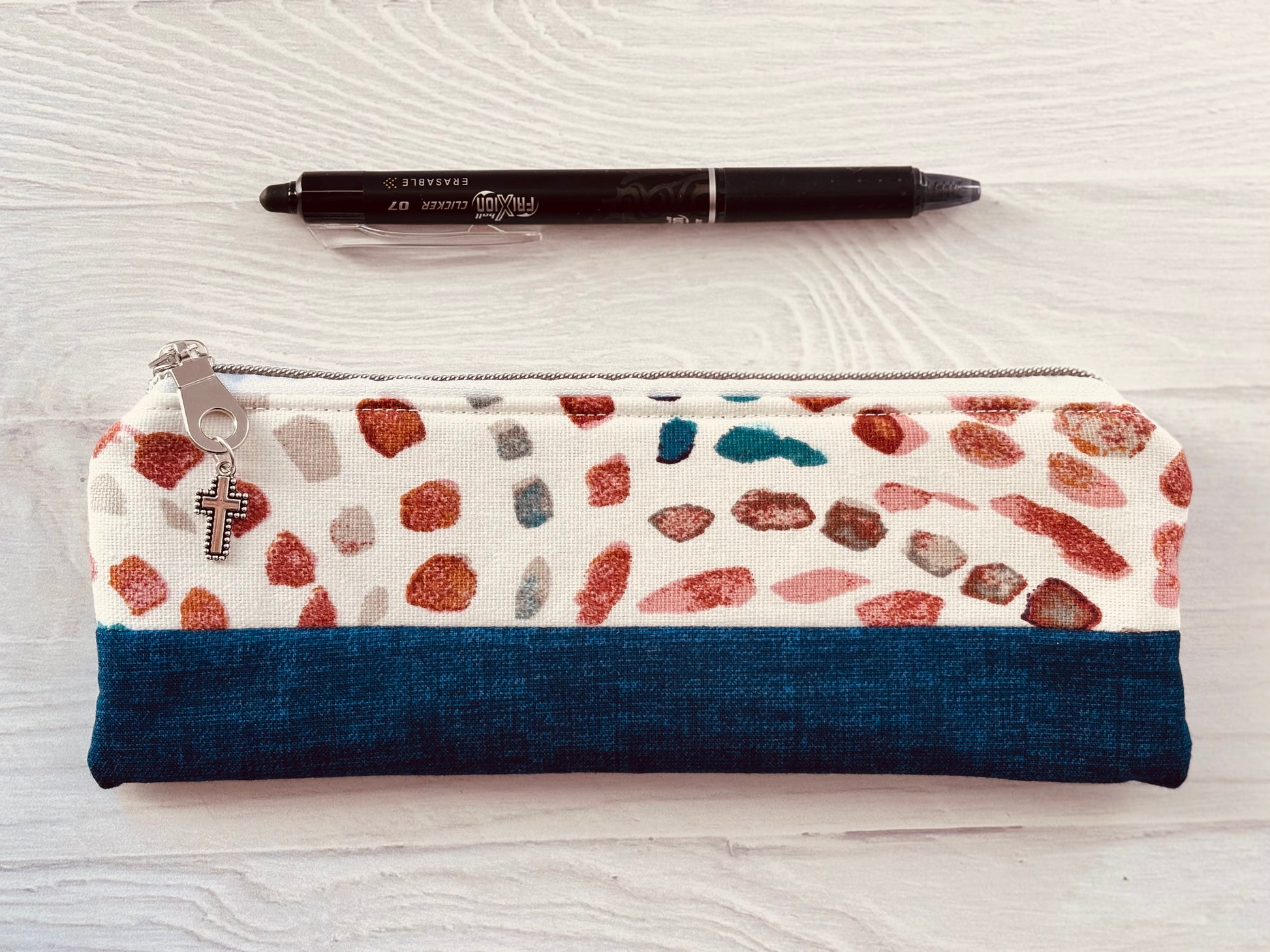 Stay organized in faith and style with our handmade quilted pencil pouches. Each pouch is crafted with beautiful cotton fabrics, accented with a contrasting base, and finished with a gold zipper pull and cross charm detail. Perfectly sized for pens, highlighters, prayer cards, or small essentials, these pouches are both practical and meaningful.