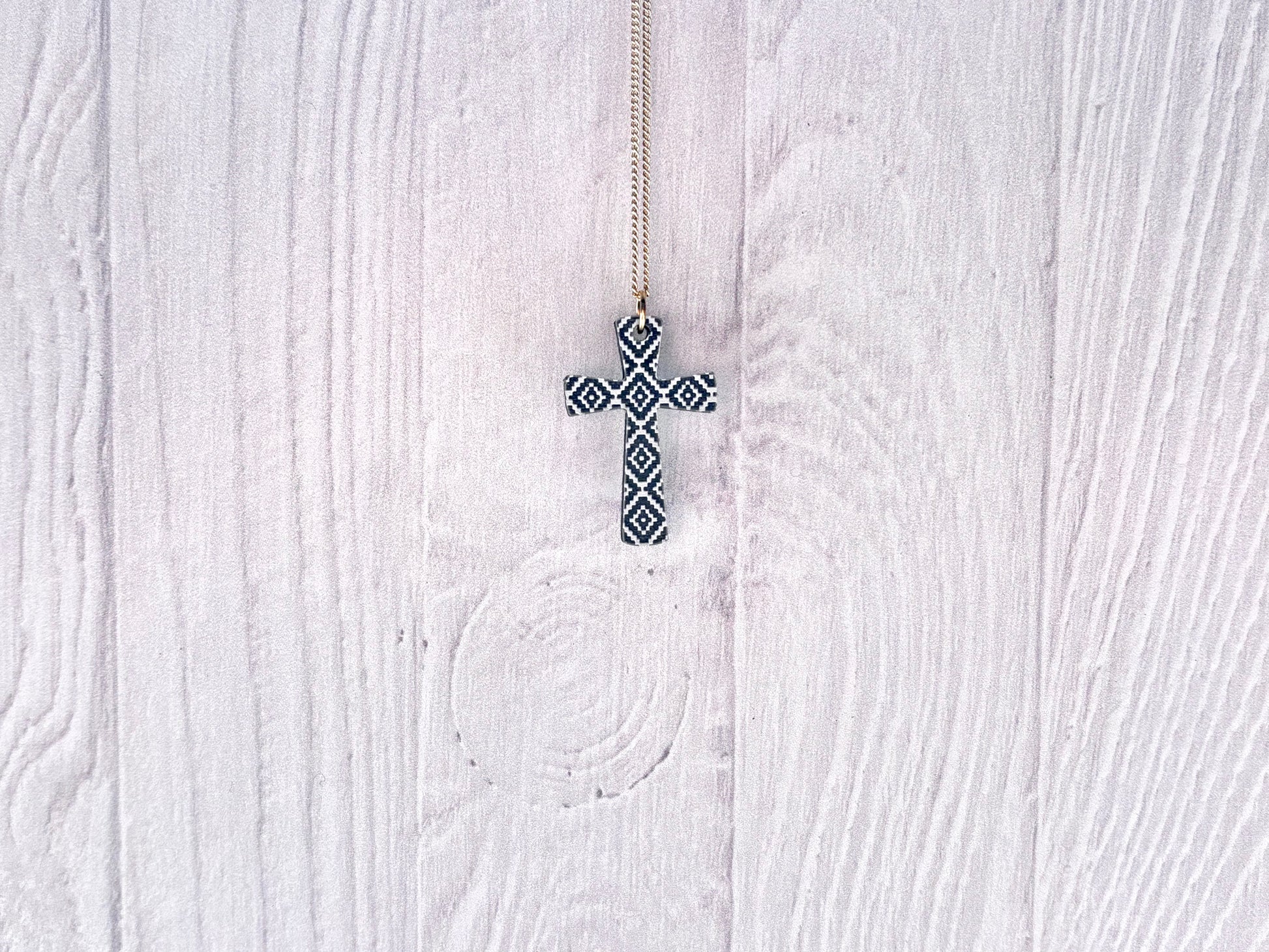 Carry your faith with style. This necklace features a bold cross pendant with a modern black-and-white geometric pattern, hung on a delicate gold-toned chain. Lightweight and versatile, it pairs beautifully with everyday outfits or makes a meaningful gift for someone special.